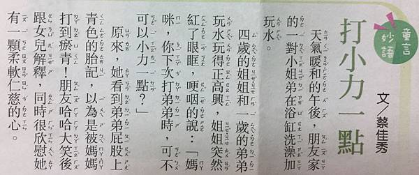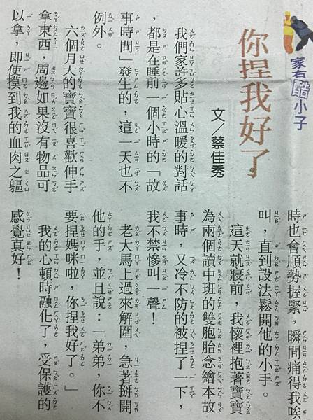 我們家許多貼心溫暖的對話,都是在睡前一個小時的故事時間發生的。 六個月大的寶寶手很喜歡握東西,若沒有物品可以拿,抓到我的血肉之軀時也會順勢握緊,總會痛得唉唉叫直到鬆開他的手。這一天就寢前,我懷裡抱著寶寶為兩個中班的雙胞胎念繪本故事時,冷不防的被捏了一下,我慘叫一聲!Muriel 發表在 痞客邦 留言(0) 人氣(23)