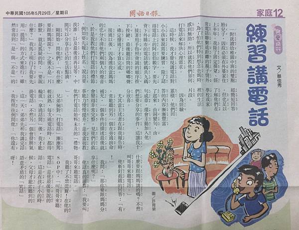 因故一對就讀幼稚園中班的雙胞胎兒子,要在外婆家住上半年,除了固定探望和電話聯繫遠距離的親子情外,為了怕他們特別想念爸媽,所以便教導他們主動打電話來解決自己的心理需求。然而,我這才發現講電話對小小孩來說,是需要練習的。首先要先背下外縣市的電話號碼共九碼,還要認得電話上的阿拉伯數字,接著再用手指照順序按下按鍵,最後聽話筒的嘟嘟聲確定撥通才算完成。接下來,因為連我這個媽也分不清楚他倆的聲音,於是我教會他們接電話的禮節,如要報上自己的名字、說要找誰,以及最後要道再見等,然後才引導他們分享生活的點滴。Muriel 發表在 痞客邦 留言(0) 人氣(45)