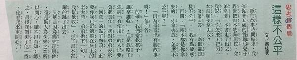 睡前故事時間結束,我催促著五歲的雙胞胎兒子趕緊把書本物歸原位,弟弟拿著一本書走了出去。我說:「你怎麼不把另一本書順便拿去收?」弟弟回答:「老師說這樣不公平。」我有點疑惑,再問:「兩本都你拿來的,你拿去放,怎麼不公平呢?」Muriel 發表在 痞客邦 留言(0) 人氣(20)